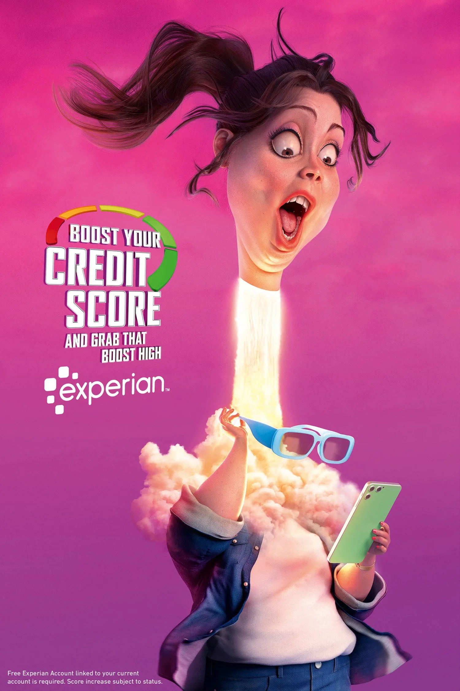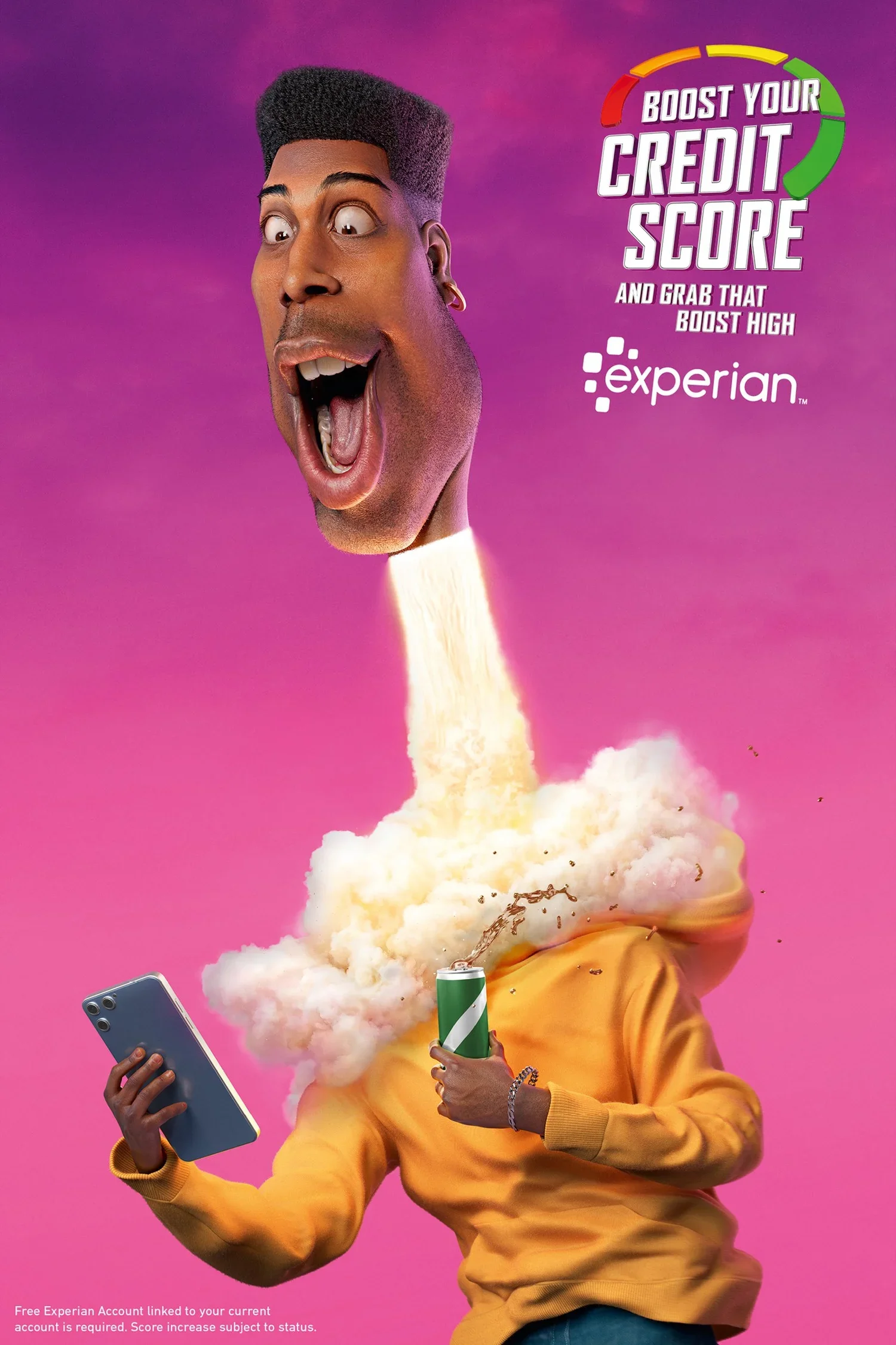 A surreal advertisement with a man's head, which has a surprised expression, replacing a rocket's flame. The rocket's body is obscured by the head, with exhaust represented by clouds and a beverage can in one hand and a phone in the other. The background is purple with promotional text about boosting credit scores from Experian.