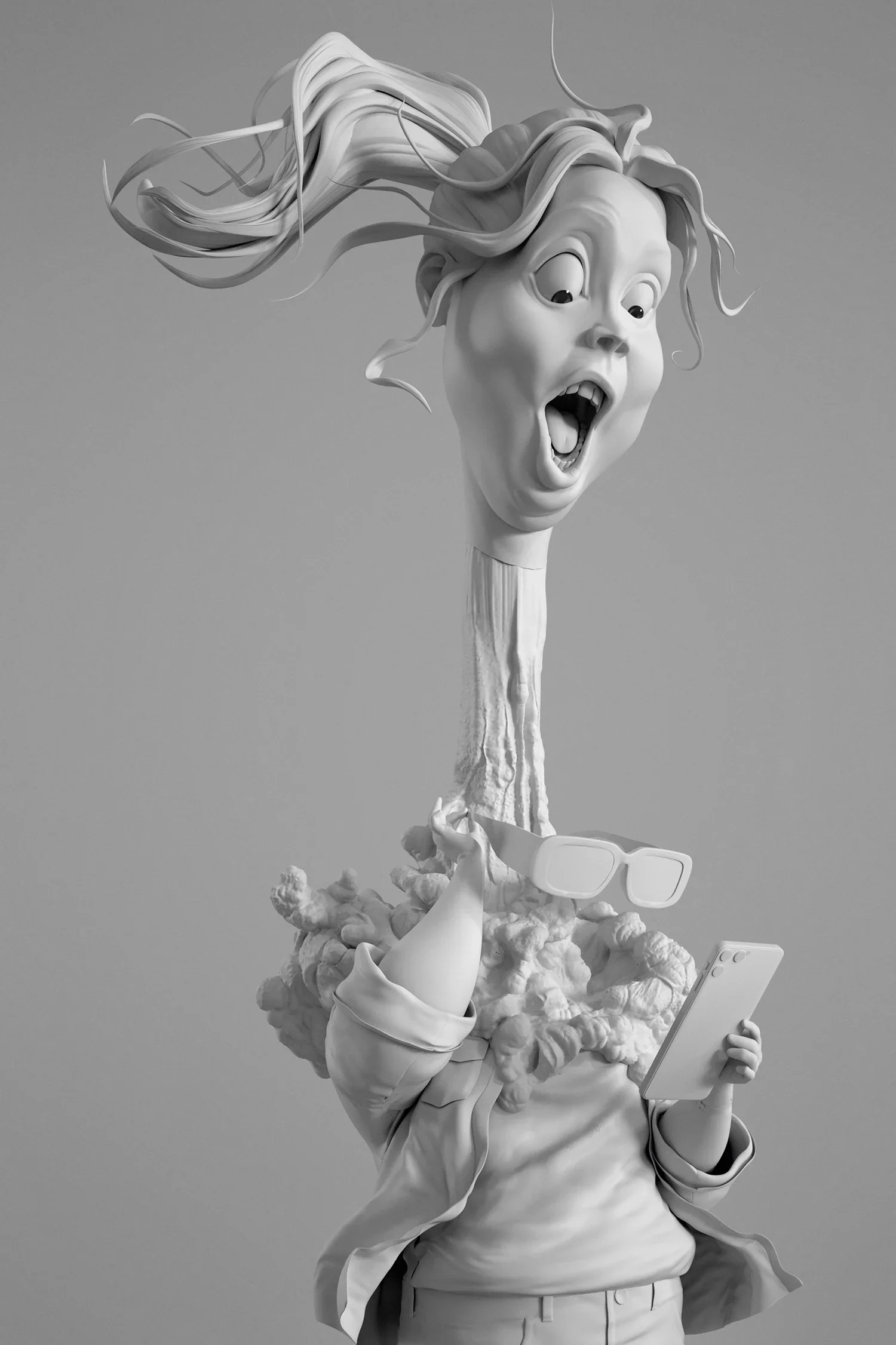 A surreal 3D sculpture of a woman with an expressive face, holding a smartphone, surrounded by clouds and with 3D glasses and sunglasses.