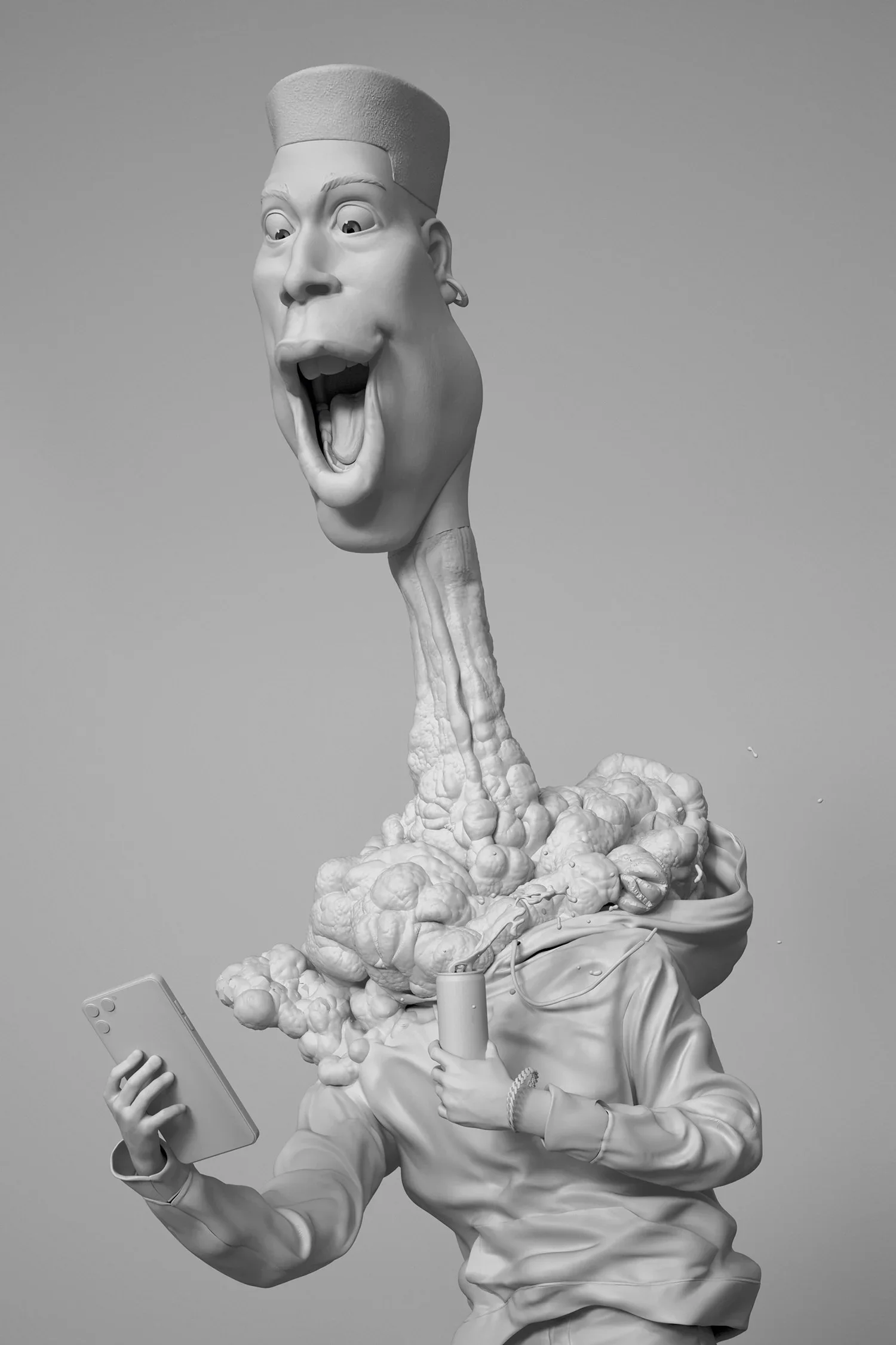 A surreal 3D sculpture depicting a person with an elongated neck erupting with an explosion of clouds and smoke, holding a cellphone in one hand and a cylindrical object in the other, with a wide-open mouth and expressive face.