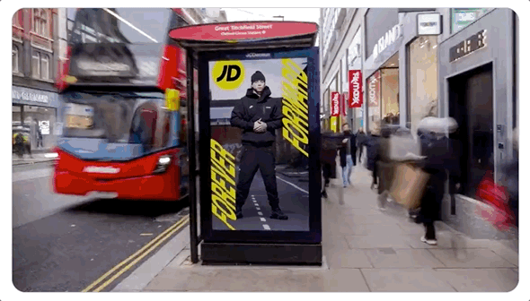 Urban street scene with people walking, graffiti on walls, and a large billboard featuring three models wearing sportswear with the slogan 'Forever Forward' and the JD logo.