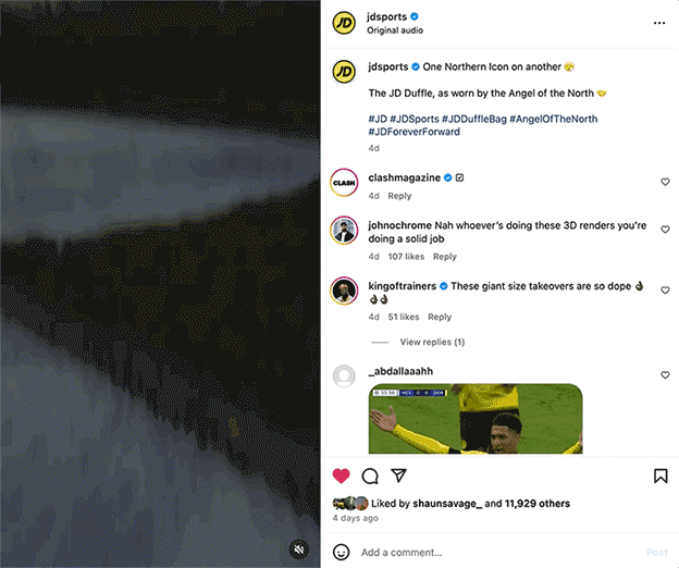 Instagram post showing a nighttime scene of a vehicle's headlights on a dark path or road, with comments praising the visuals and a small partially visible still image of a football player making a gesture.
