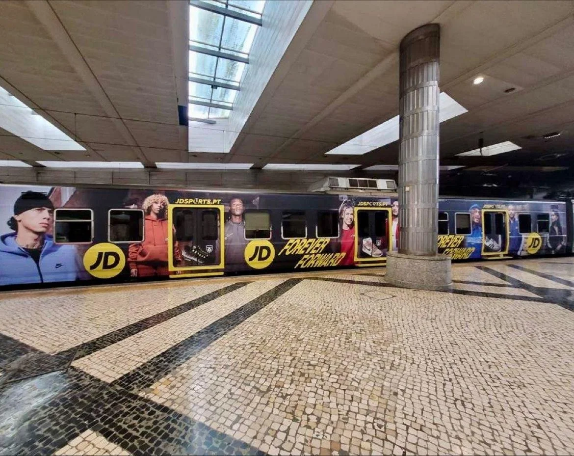 Underground train car with JD Sports advertising featuring diverse models, parked on a platform with a patterned tiled floor.