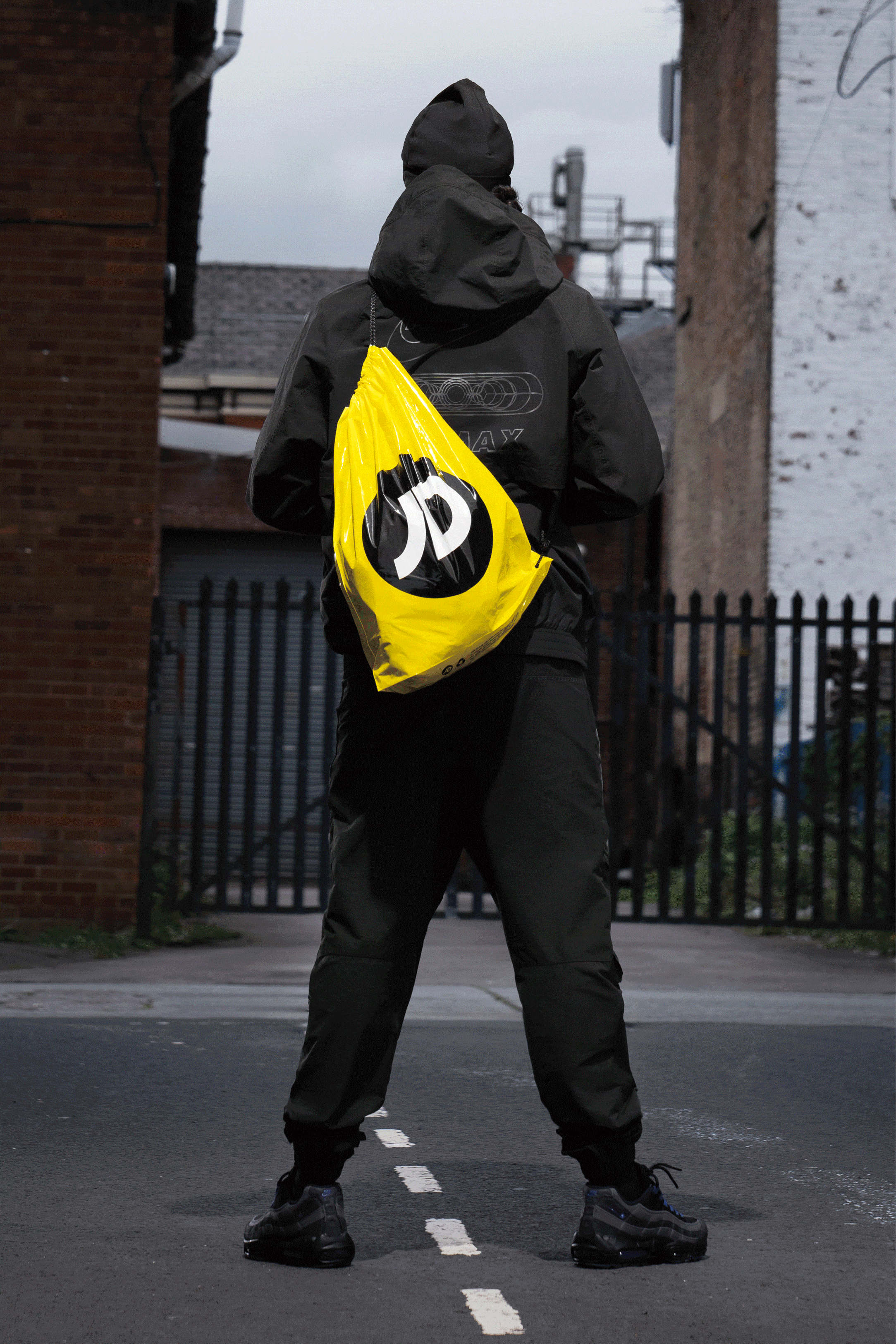 Person dressed in black clothing and black shoes standing on a street with a yellow bag with a black logo seen from behind.