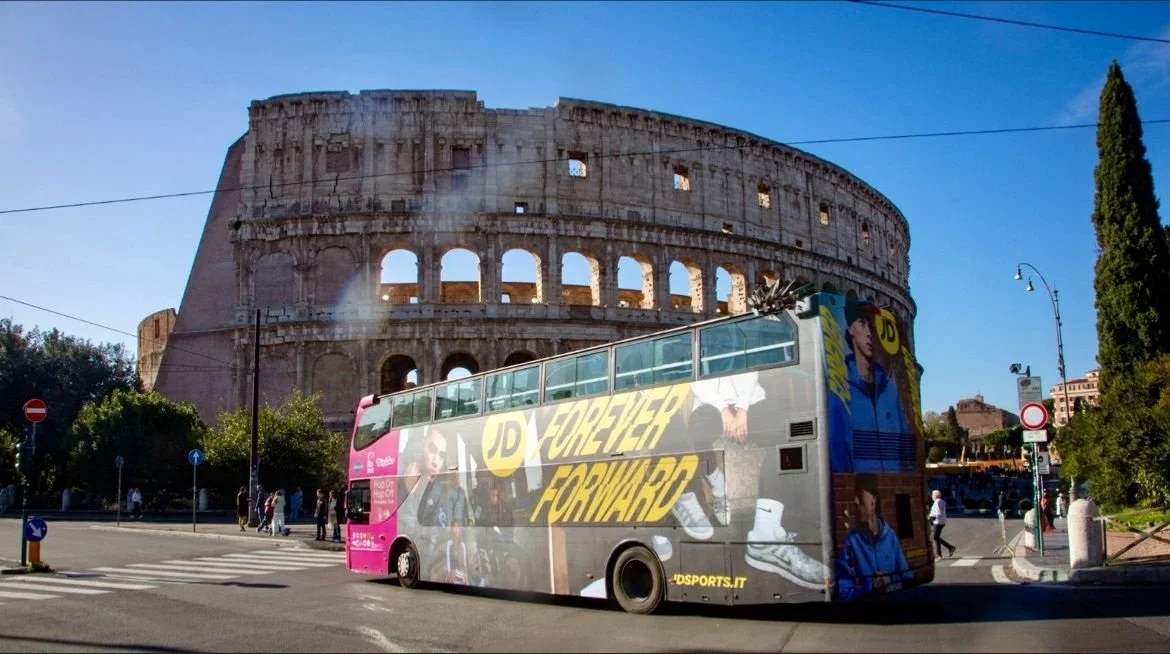 A double-decker bus with JD Sports advertisement in front of the Roman Colosseum in Rome, Italy.