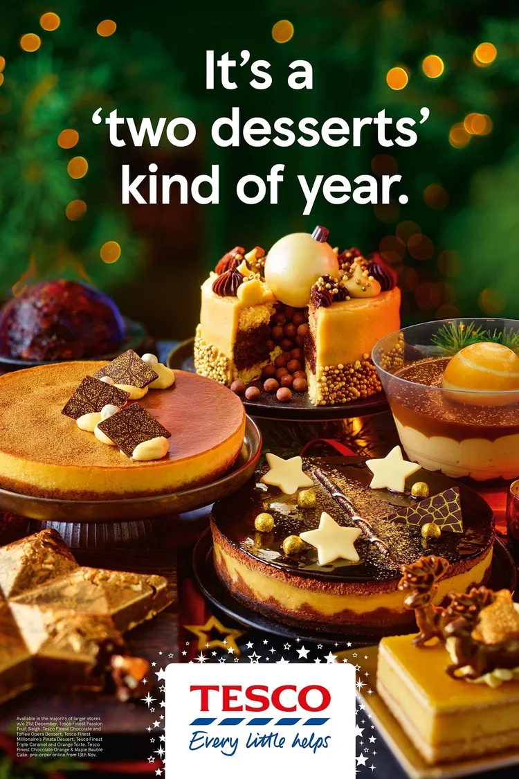 Assorted desserts including cakes, a fruit-topped mousse, and chocolates with holiday decorations, with a Tesco logo and the slogan "Every little helps."