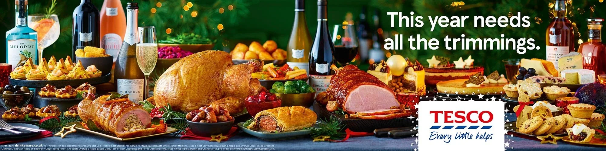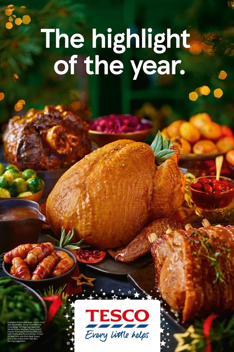 A festive holiday display with a cooked turkey surrounded by side dishes, including vegetables, stuffing, and cranberry sauce, with the text 'The highlight of the year' and Tesco logo.